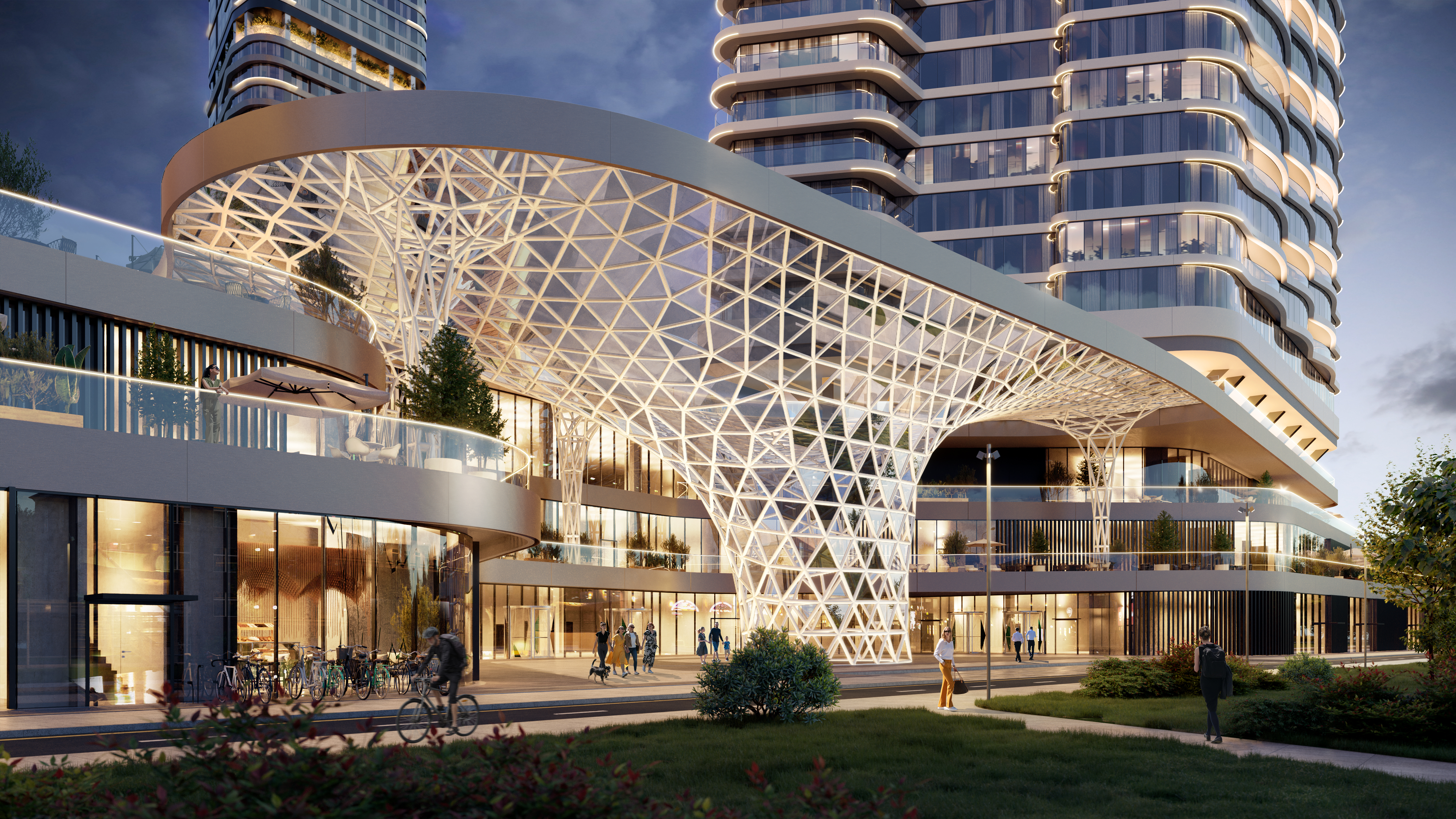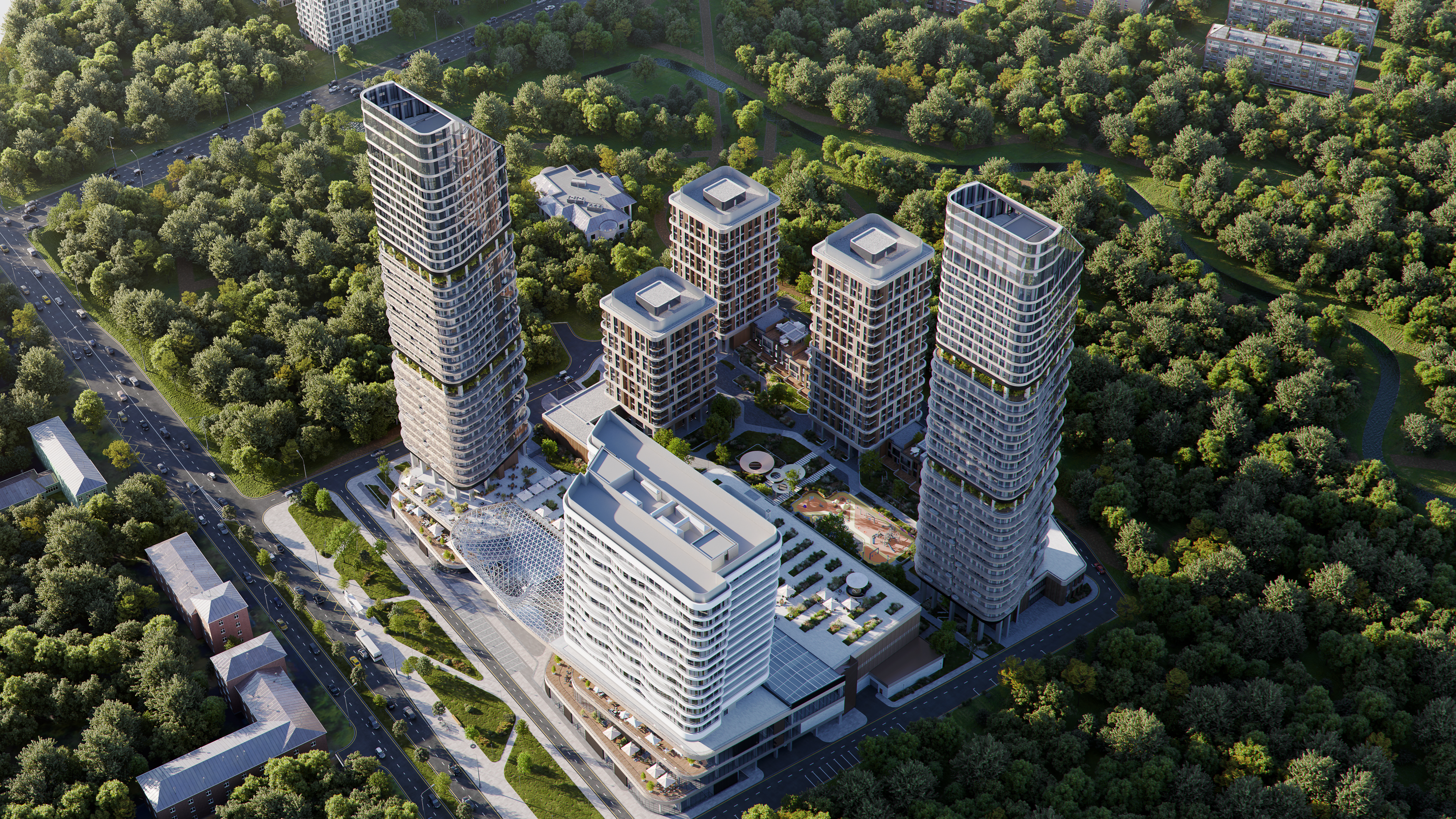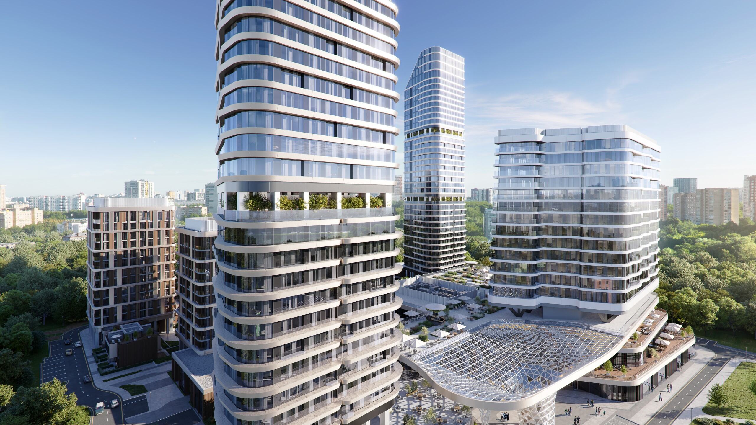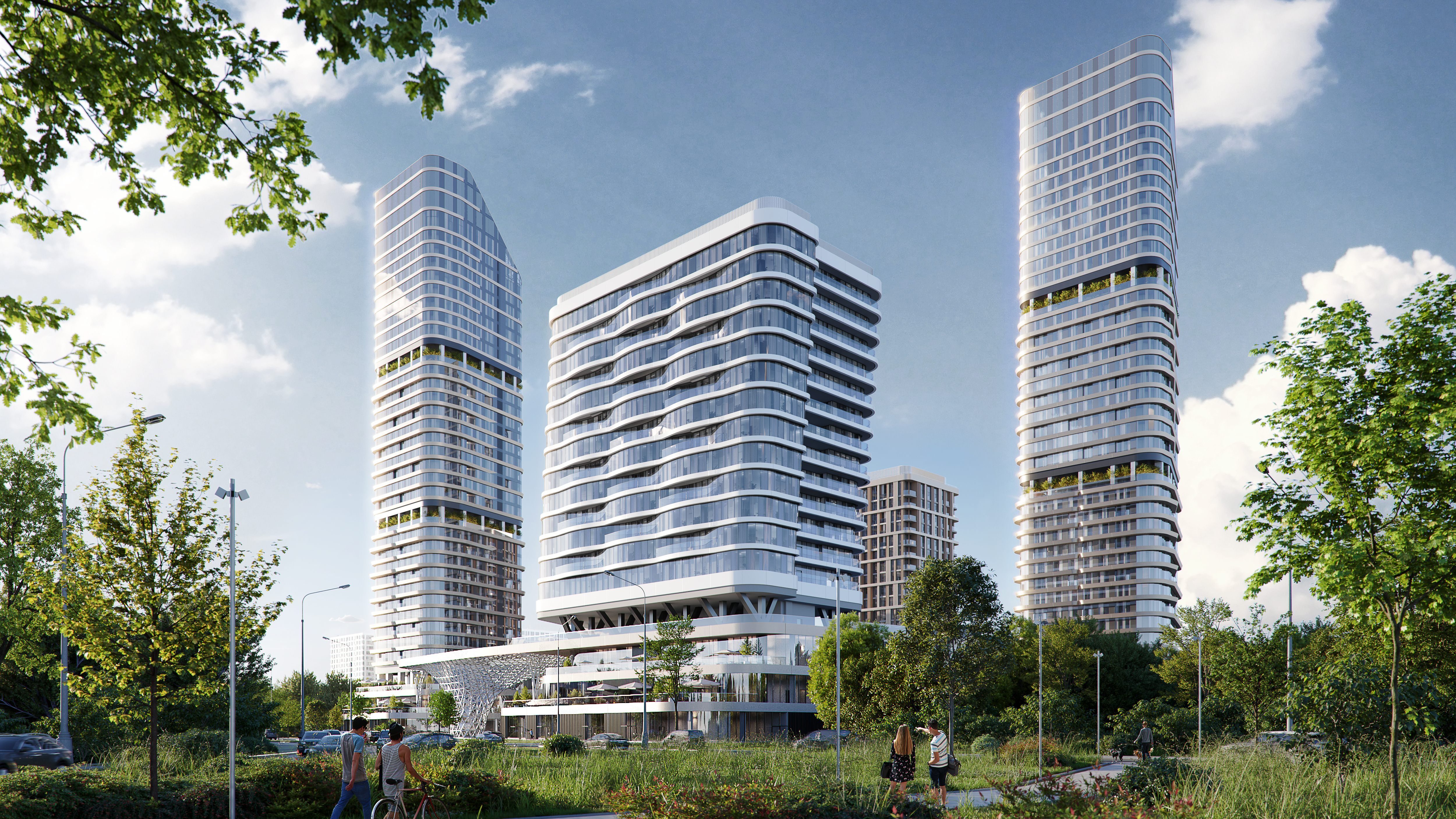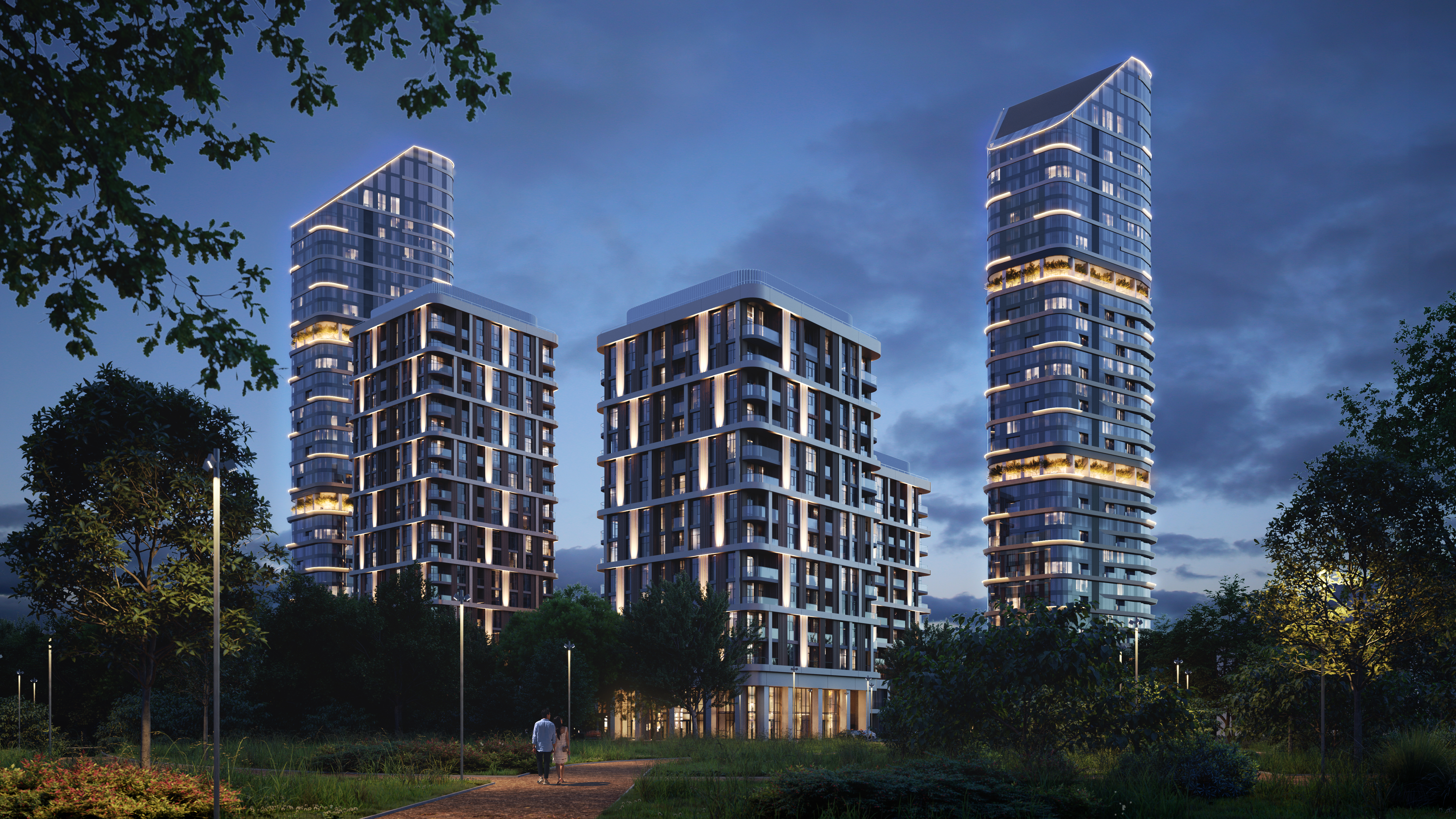 Образы башен-доминант со скругленными фасадами объединяются в яркий силуэт. Продолжает тему реки волнообразная структура многофункционального комплекса, который появится на территории квартала. Архитектурную форму и объем зданий подчеркнет концепция дизайнерского освещения, которое в вечернее время позволяет сохранить запоминающийся силуэт как всего квартала, так и его отдельных доминант.